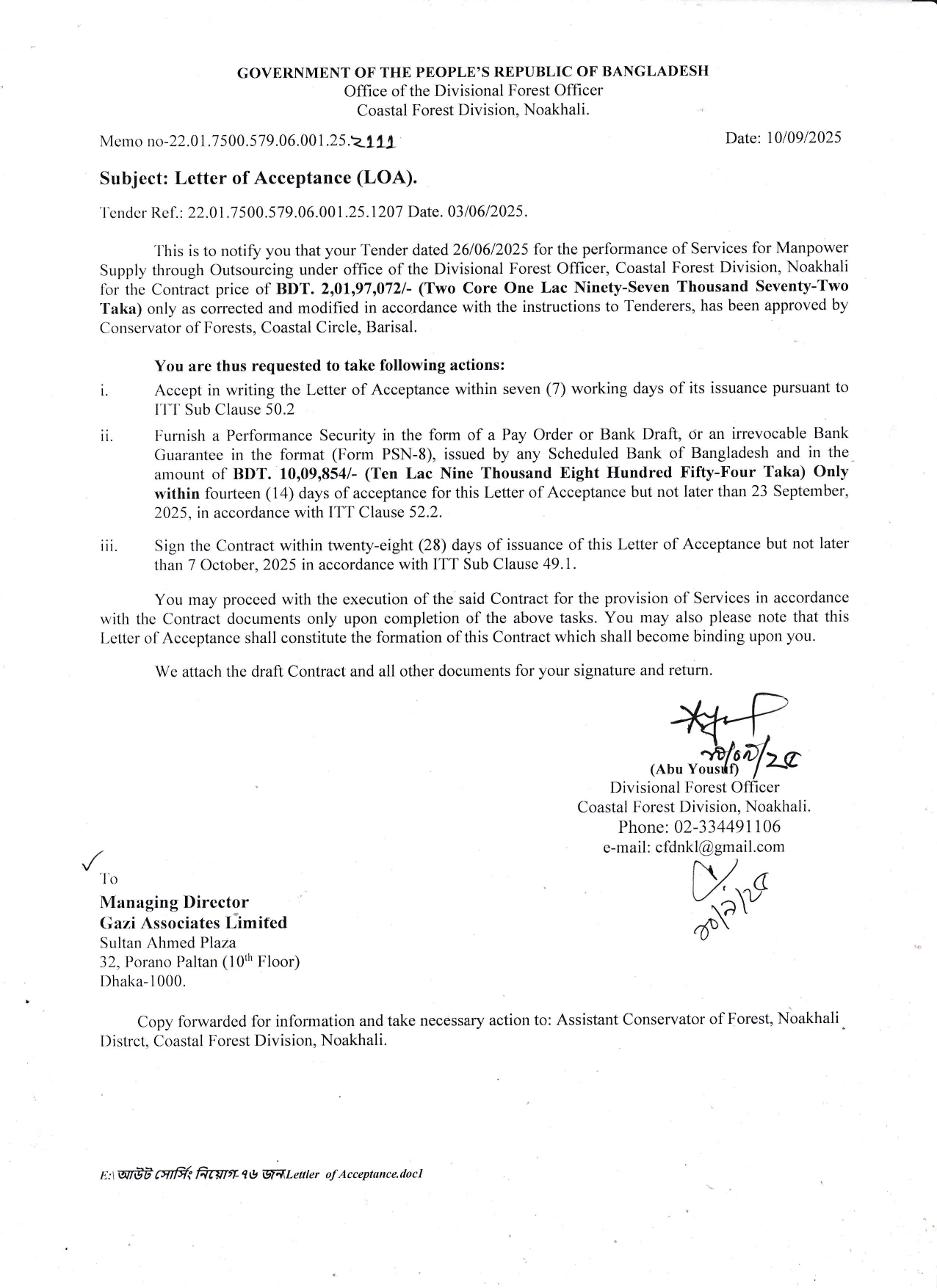 This is to notify you that your Tender dated 29.05.2025 for the supply of goods and related Services Equipment for Machine Shop (CNC) for BITAC, Jamalpur (Package no: GD-48) for the Contract Price of USD 11,97,990.00 (One million, one hundred ninety-seven thousand, nine hundred ninety dollars) as corrected and modified in accordance with the Instructions to Tenderers, has been approved by Director General BITAC.