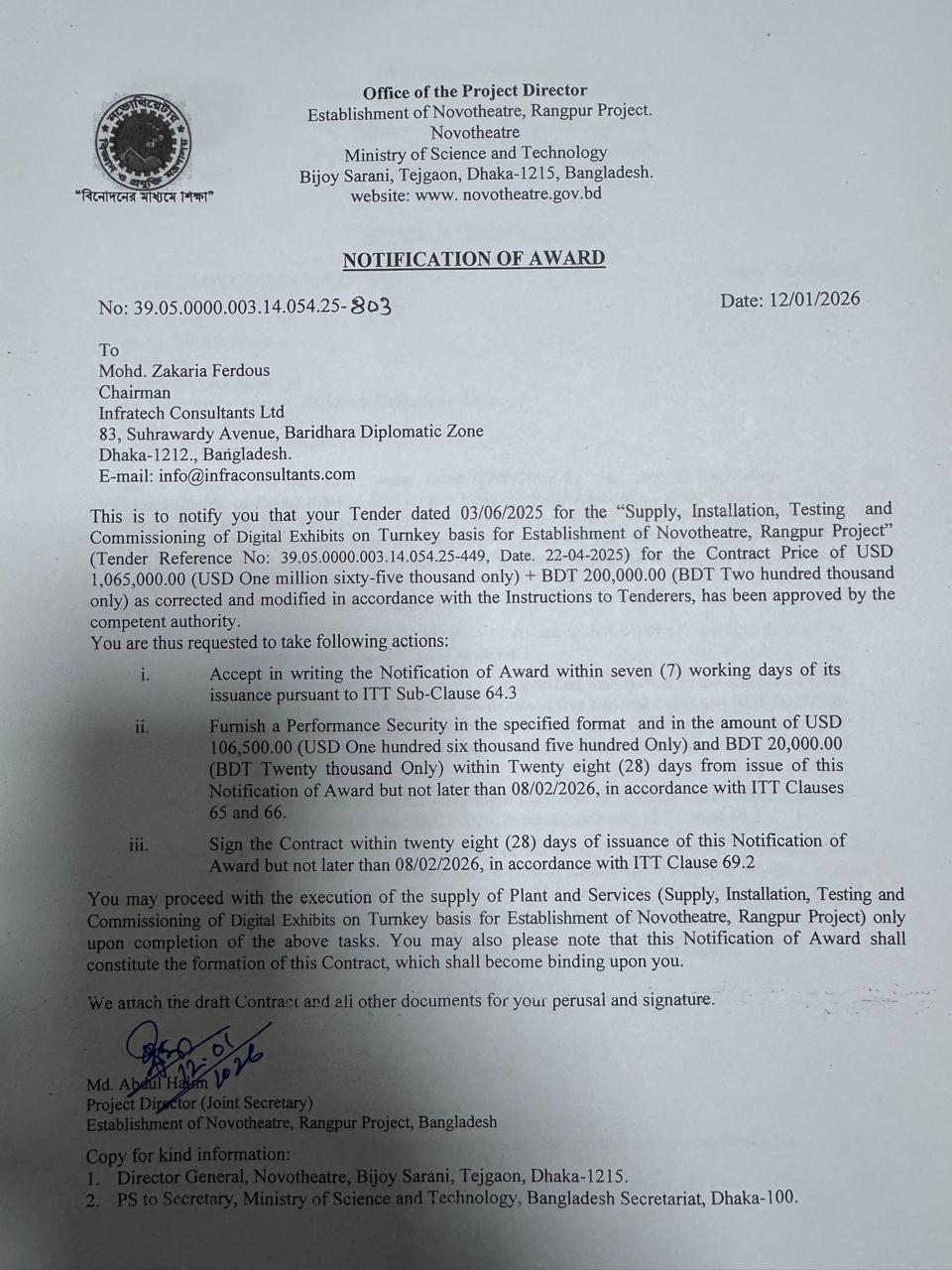 “Supply, Installation, Testing and Commissioning of Digital Exhibits on Turnkey basis for Establishment of Novotheatre, Rangpur Project” |