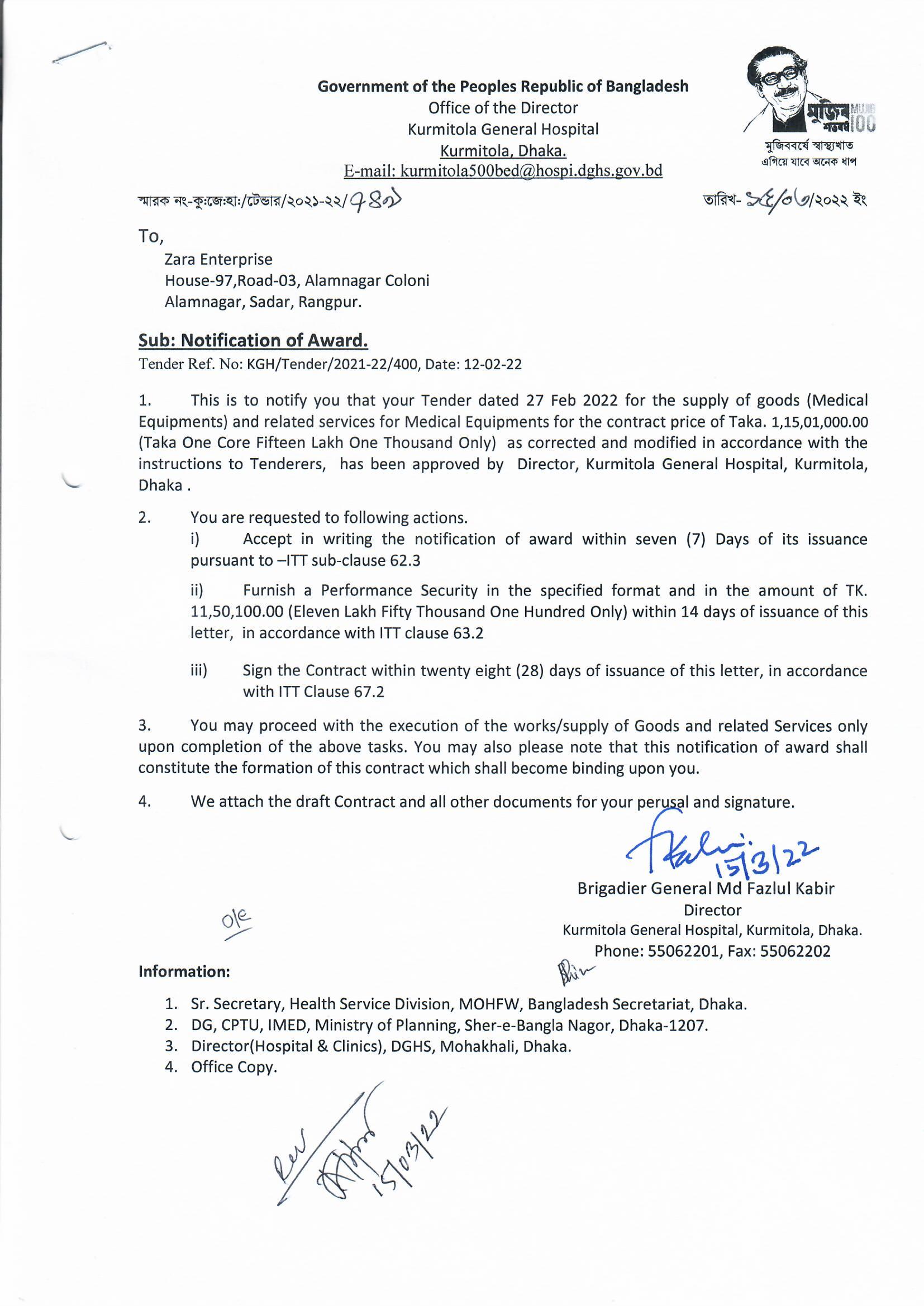 Notification of Award agenist Tender Ref No- KGH/Tender/2021-22/400, Tate: 12-02-22