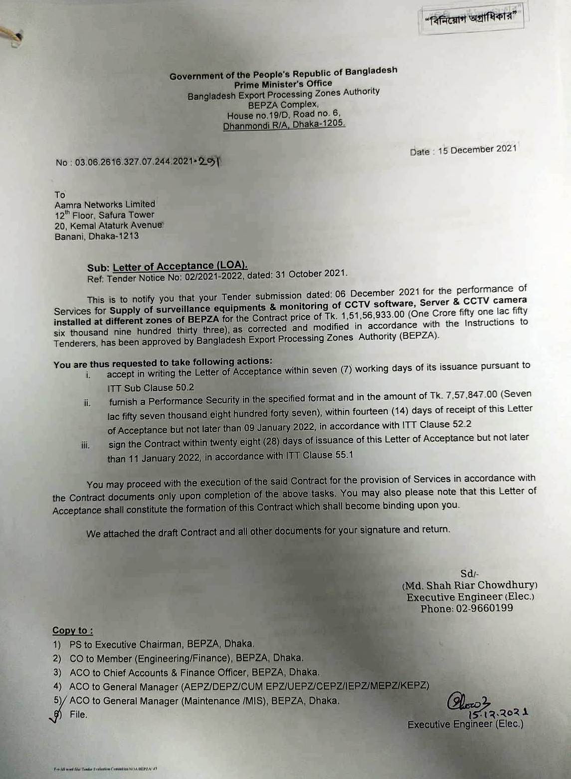 Supply of surveillance equipments & monitoring of CCTV software, Server & CCTV camera installed at different Zones of BEPZA |